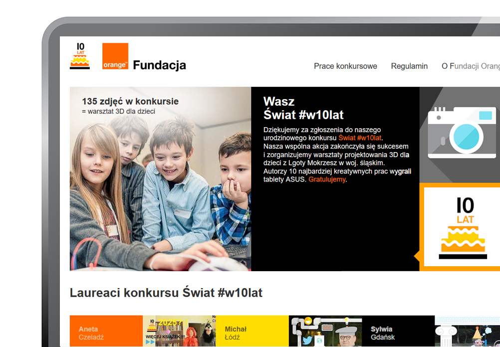 Wasz Świat #w10lat to nazwa konkursu fotograficznego dla Fundacji Orannge, wykonanego na zlecenie Clear Communication Group. Aplikacja pozwała na edycję przesłanej fotografii, dodania do niej ikon i obramowań.
