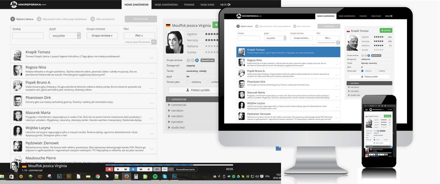 System zamówień pozwala na realizację nagrania lektorskiego - od wyboru lektra i złożenia zamówienia do rozliczenia i płatności. Cały proces jest zautomatyzowany i nadzorowany przez operatora odbywa się przez platformę.
